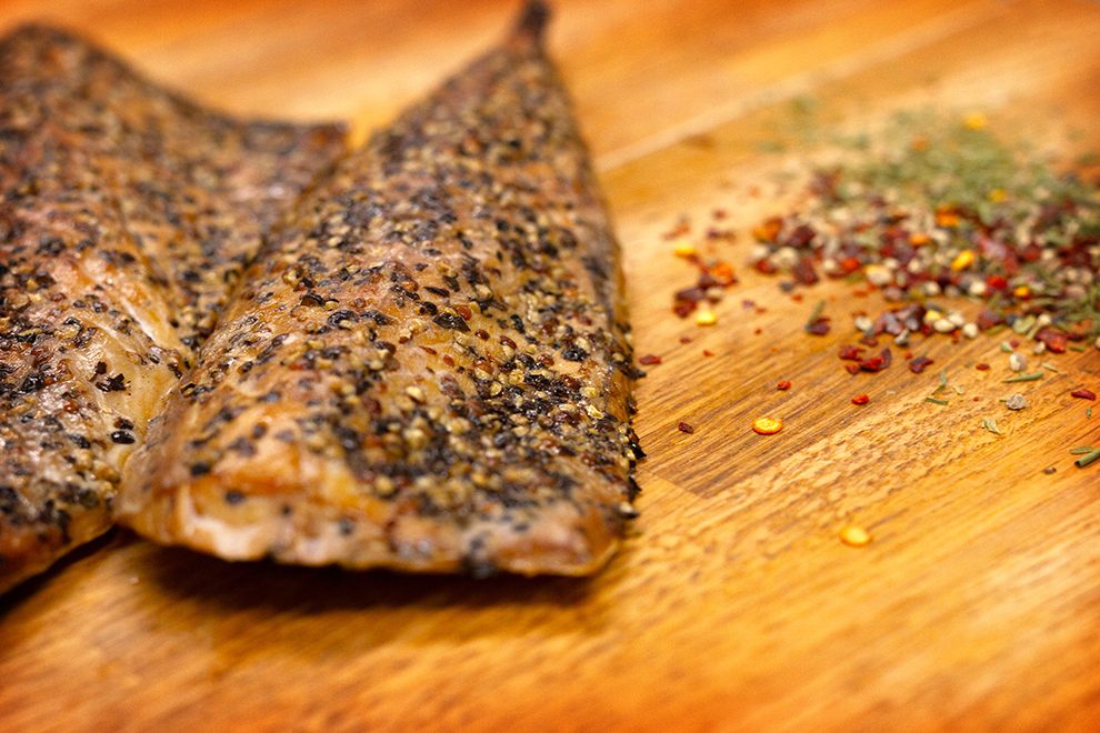 Our Hot Smoked Pepper Mackerel Fillets, two in a pack, lovingly prepared and cooked on site £18.50kg